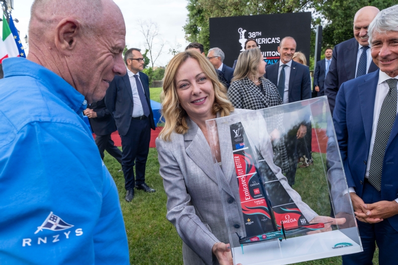 Giorgia Meloni,Presidente del Consiglio dei Ministri, è poi salita sul leggio posto sull’azzurro, il colore di Napoli e dell’evento, per pronunciare un discorso di grande impatto, affermando: “Sono onorata di dare oggi il benvenuto a Roma al Defender Emirates Team New Zealand, nonché ai trofei America’s Cup e Louis Vuitton Cup, simboli mondiali della passione sportiva e dell’eccellenza dell’innovazione… Oggi celebriamo l’arrivo in Italia, per la prima volta nella storia, dell’America’s Cup, ovvero il più antico, il più famoso, il più prestigioso trofeo velico al mondo, un evento globale che coinvolge milioni di appassionati in tutto il mondo e che rappresenta una sintesi unica e straordinaria tra tradizione e futuro, tra avanguardia ingegneristica e spirito agonistico.”